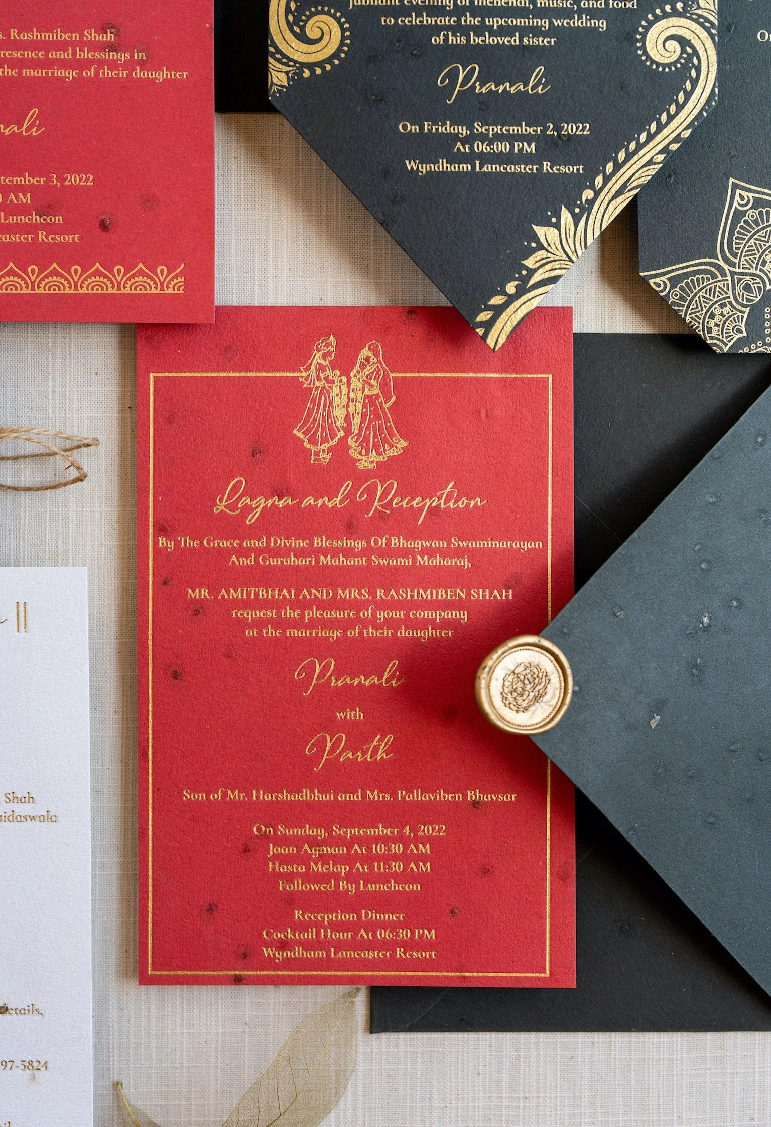 Each event was printed on a separate insert. We chose custom color seed paper to make the invitations eco-friendly. We used tulsi seeds for the paper because it is considered holy in Indian culture. Another beautiful fusion of traditional and modern.